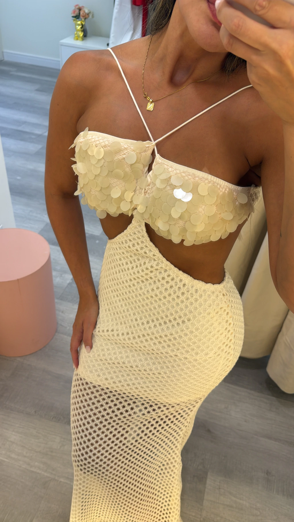 Seu design artesanal em crochê valoriza a feminilidade com um toque artesanal e moderno. O forro garante que o vestido seja confortável e evite transparências, enquanto o elastano permite liberdade de movimento.